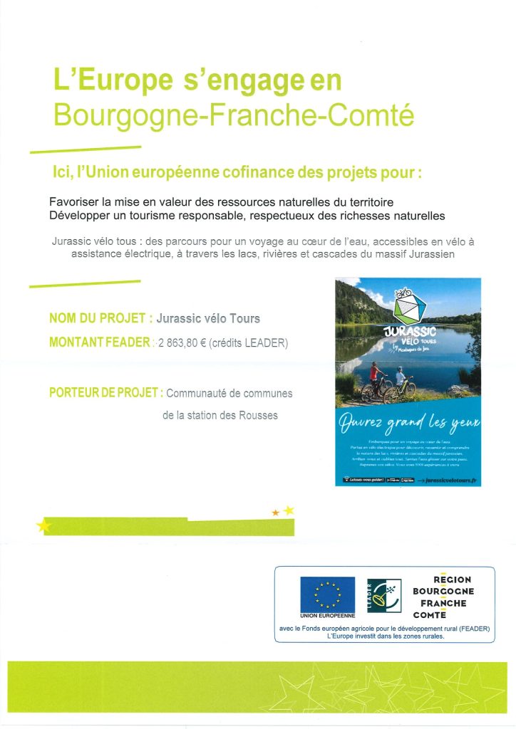 Cofinancé par le programme européen LEADER, le territoire de la Comunauté de communes de la Station des Rousses intègre 4 parcours VTT et eVTT reliés du Nord au Sud. Une liaison par la forêt du Risoux relie les parcours avec ceux de la Communauté de communes Haut-Jura Arcade par Bellefontaine depuis Bois d’Amont.
